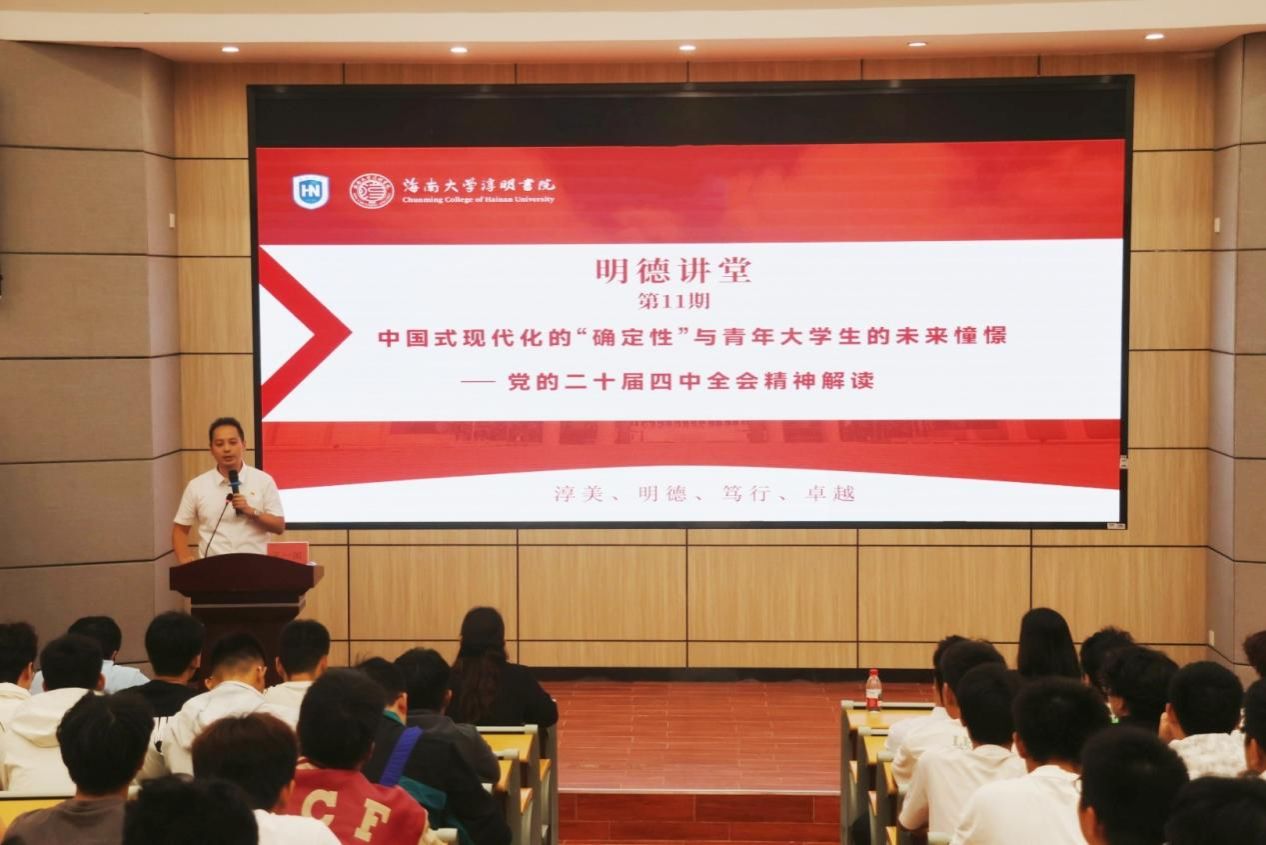 为进一步深入学习贯彻党的二十大及二十届四中全会精神,10月25日上午,淳明书院第11期“明德”讲堂在学校邵逸夫学术交流中心1111报告厅举办。本期讲堂邀请海南大学马克思主义学院副院长、博士生导师、海南省拔尖人才王一闳授课,书院200余名师生参加讲座。