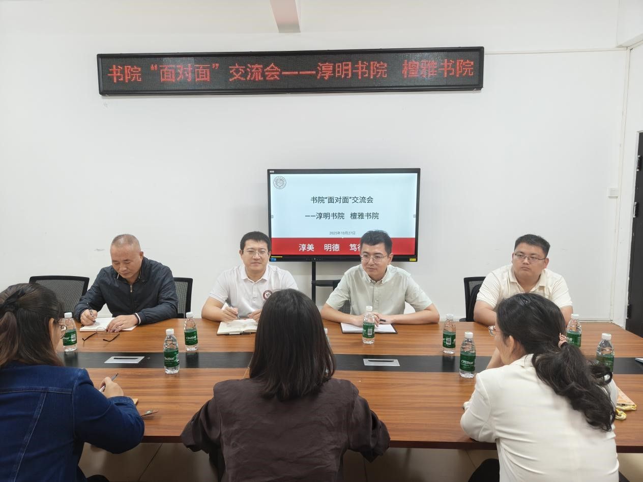 2025年10月27日上午,淳明书院与檀雅书院在14栋党员之家会议室开展书院“面对面”座谈交流会。檀雅书院党委书记孙涛、党委副书记朱泽琛,淳明书院党委书记周郭军、党委副书记武琼及辅导员代表参加座谈。