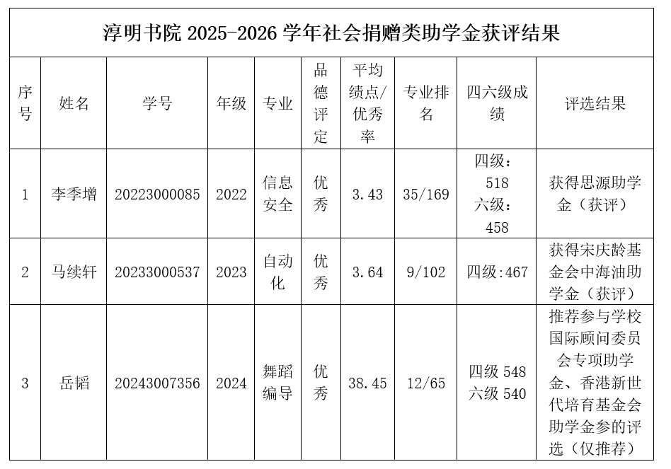淳明书院关中国宋庆龄基金会中海油大学生助学基金等助学金评选结果公示