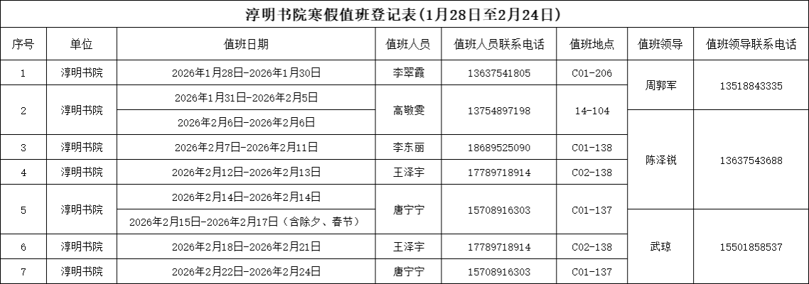 海南大学淳明书院关于寒假教职工值班安排通知