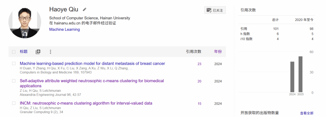 裘昊晔,中共党员,海南大学淳明书院、计算机科学与技术学院2021级软件工程(NIIT)专业本科生。主持国家级大学生创新创业训练项目1项,参与国家自然科学基金项目4项。参与发表SCI期刊论文10篇,EI检索论文3篇,其中1篇入选ESI高被引论文,7篇为中科院一区期刊论文,1篇为CCF推荐A类会议论文,授权国家发明专利1项。现已被推免至东南大学攻读硕士学位,并成功进入与澳大利亚蒙纳士大学的双学位联合培养项目,踏上新的征程。